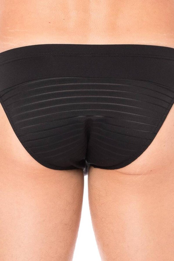 Look très moderne pour ce slip noir de haute qualité et très confortable à porter. Sur l'avant, style échancré avec des rayures larges opaques et des plus petites transparentes. Sur l'arrière, ce slip noir est rayé également et assorti à l'avant. Une large bande élastique assure son confort